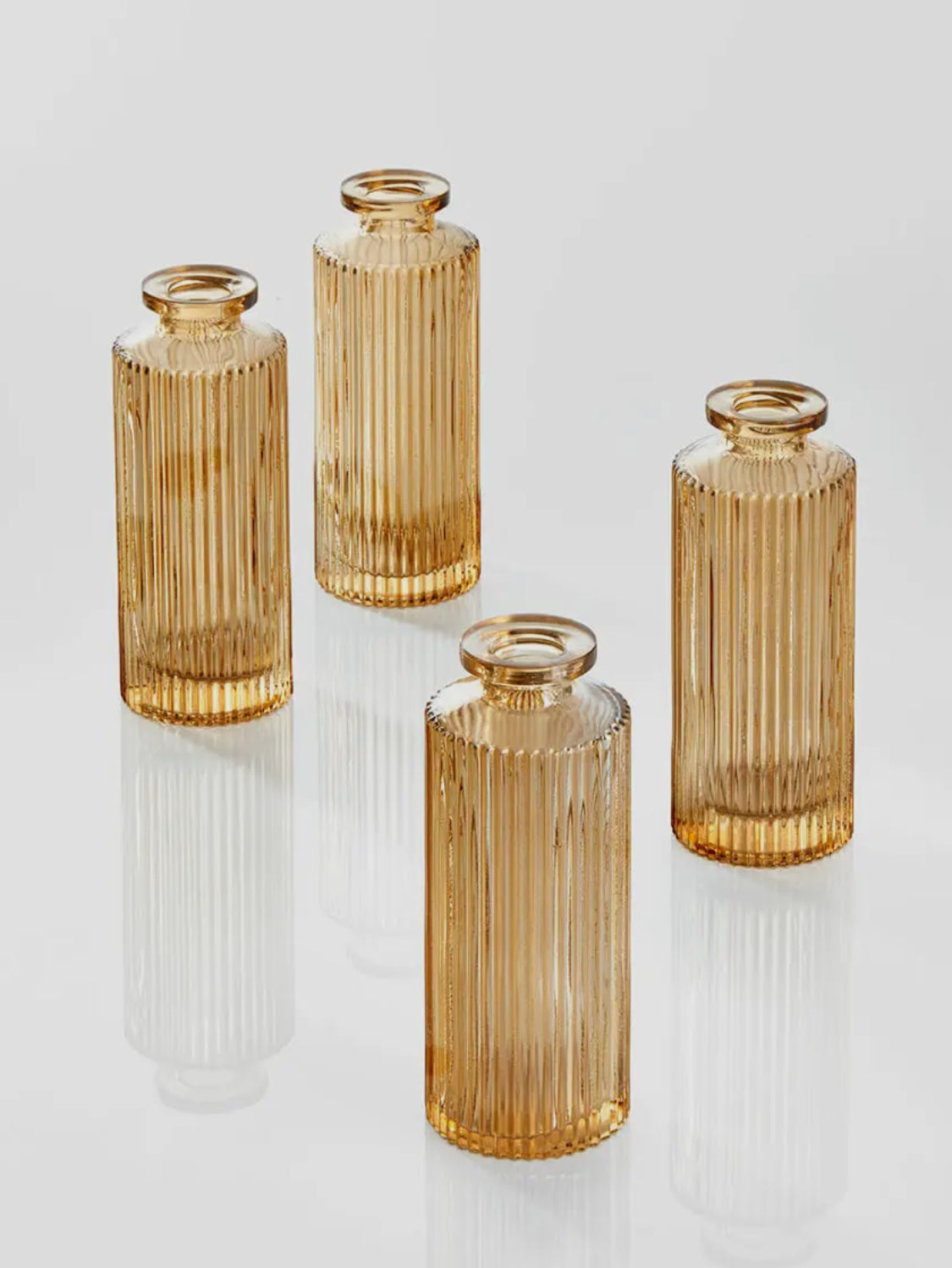 This amber pleated glass bottle is a testament to exquisite craftsmanship, featuring a vertical pattern and smooth glass neck. Its elegant look and versatile use make it a perfect centerpiece for any room or event.
