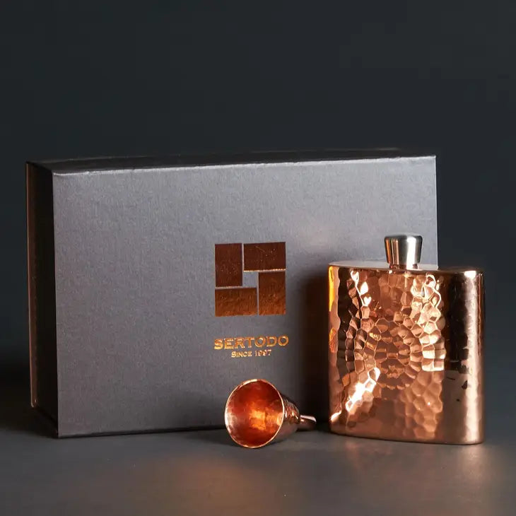 This hand-crafted hip flask features a heavy gauge construction for a lifetime of use and includes a stainless steel cap, copper neck, precision machined tin lining, and 9 fl. oz. capacity. Accompanied by a copper funnel for easy pouring and a commemorative 20-year anniversary gift box, it's a perfect gift to last for generations.