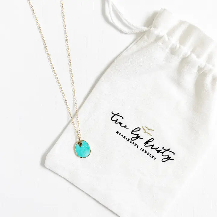 This best-selling Free Spirit Turquoise Necklace features a genuine turquoise pendant electroplated in gold. The 18" signature 14k gold-filled dainty cable chain is certified and made in the USA, ensuring high quality and no tarnishing. Each natural stone is unique and comes with a 100% organic cotton jewelry pouch.