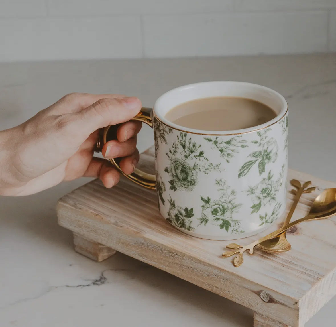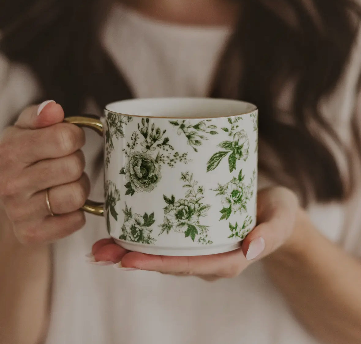 Introducing these NEW Green Delft Mug with Gold Handle. A stylish mug with flowers, perfect for tea or coffee lovers.